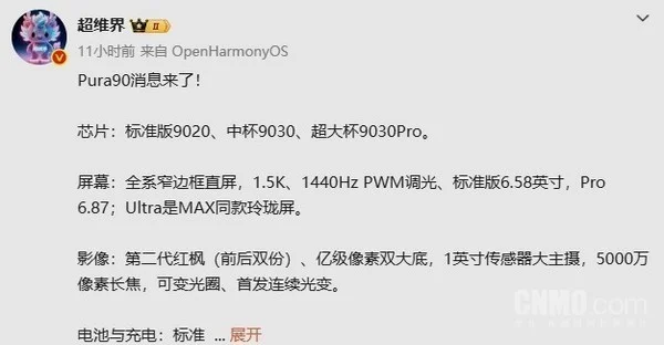 近日,数码博主“超维界”曝光了华为下一代旗舰Pura 90系列的详细配置信息。据CNMO了解,新机有望在2026年春季发布,并全面强化其高端市场竞争力。